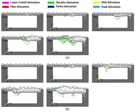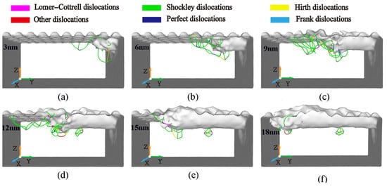 Figure 15a, it is seen that when the displacement distance of the cutting particles is smaller, the number and types of dislocations inside the workpiece are relatively fewer. This is because the material is still in the initial cutting stage, and at this point, the energy generated by cutting is insufficient to nucleate more dislocations. Shockley incomplete dislocations are generated by the decomposition of total dislocations. This is because the total dislocation on the (111) plane possesses high energy and is extremely unstable, and it will automatically decompose into two incomplete dislocations. Shockley dislocation can only make a sliding motion on the (111) plane where it is located and cannot climb from one plane to another. Perfect total dislocations and Hirth dislocations are generally produced through dislocation reactions under the influence of stress and energy. When the displacement distance of the cutting particles reaches 6 nm, there is a rapid increase in both the number and types of dislocations. The total length of the dislocation line reaches 491.919 Å, which is attributed to the combined effect of stress and energy. Shockley dislocations on different (111) planes can generate Lomer–Cottrell dislocations through dislocation reactions. It is also a kind of pressure rod dislocation, and its existence will also hinder the movement of Shockley dislocation. When the displacement distance of cutting particles reaches 9 nm and 12 nm, compared to any other stage, the number and types of dislocations is higher. The total length of the dislocation line measures 921.334 Å and 866.715 Å, respectively. Frank dislocation occurs when the displacement distance of the cutting particles is 9 nm; this kind of dislocation is also called partial dislocation. Different from Shockley’s incomplete dislocation, it can only perform a climbing motion on the (111) plane, but not a sliding motion. When the displacement distance of the cutting particles increases, the number and types of dislocations are greatly reduced and gradually tend toward a stable state. From