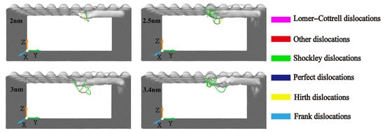 In the micro-cutting process, the workpiece undergoes a squeeze–cutting action from the diamond abrasive particles, the workpiece atoms in the cutting area are displaced, and the original lattice structure changes, resulting in dislocations in the workpiece material. Dislocations are the dividing line between the slipped area and the unslip area on the slip surface of the crystal; its existence makes each atom in the crystal shift from its original equilibrium position in its natural state. When the position of the dislocation line changes, the configuration of the atoms in the crystal also changes. Therefore, the evolution of internal dislocations in the workpiece during the machining process is of great significance for the machining effect. In the figure, purple, green, yellow, red, blue, and light blue represent Lomer–Cottrell dislocations, Shockley dislocations, Hirth dislocations, other dislocations, perfect dislocations, and Frank dislocations, respectively.