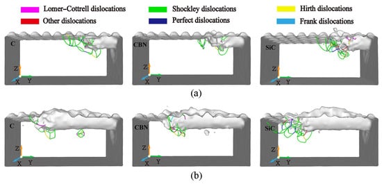Figure 15. It can be observed that the dislocations mainly nucleate in the shear slip zone and the subsurface area and some dislocations are in contact with each other and intertwined in a certain shape when they are squeezed and sheared by abrasive particles. Each dislocation will slip and expand along its Burgers vector. Some dislocations will extend to the free surface of the workpiece and then annihilate, and some dislocations will evolve into other dislocation defects through dislocation reactions. From