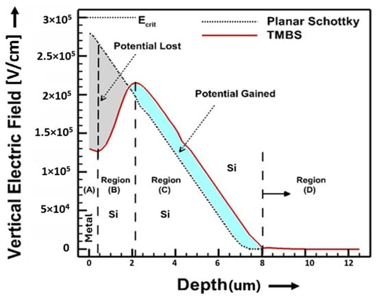 The vertical electric field along the center of the mesa region can be divided into four distinct regions: Region (A), located near the Schottky surface within the zero-bias depletion width, represents the initial field near the surface interface where the Schottky barrier predominantly influences the field distribution; Region (B), which extends from the zero-bias depletion width down to the bottom of the trenches, serves as a critical area where the charge sharing between the MOS capacitor and Schottky junction takes place; Region (C), from the bottom of the trenches to the bottom of the drift region, represents the portion of the field influenced by the underlying drift region characteristics; and a fourth region, Region (D), which is only present if the device enters punch-through mode in the highly doped substrate (see Figure 1).