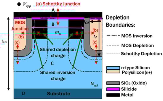 Figure 5 shows the charge in the mesa region between the MOS trenches available for the Schottky depletion region for four different scenarios: (a) planar Schottky junction without any charge sharing, (b) Schottky junction with the MOS capacitor in full inversion, (c) Schottky junction with MOS capacitor with shared inversion charge as proposed in the present work according to Equations (4) and (10), and (d) Schottky junction with MOS capacitor with deep depletion (Qinv = 0). Each scenario highlights different modes of interaction between the MOS and Schottky junctions, offering a comparative view of how varying inversion charge conditions influence the charge distribution within the Mesa region. For case (a), it is easy to understand that the total depletion charge available for the Schottky junction increases proportionally to V a p p as all the depletion charge is due to the Schottky junction. Since there is no charge sharing in this planar configuration, the depletion region’s behavior aligns with that of a traditional Schottky diode, where the depletion charge is directly related to the applied reverse bias, resulting in a simple square root dependency.