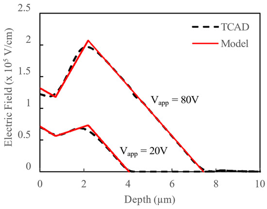 Figure 6. Comparison of electric field obtained from TCAD simulation and proposed analytical model for applied reverse bias of 20 V and 80 V.