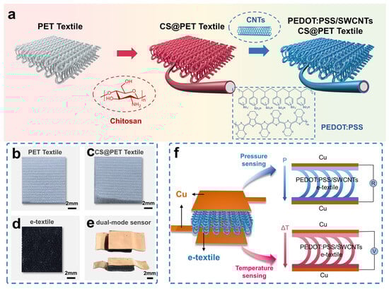 (a) Schematic of the preparation process of the PSCP sensor and the structure of the materials; (b) Initial textile; (c) CS@PET textile; (d) PEDOT:PSS/SWCNTs/CS@PET e−textile; (e) The physical drawing of the PSCP sensor; (f) Schematic structure of a dual-mode sensor for pressure and temperature.