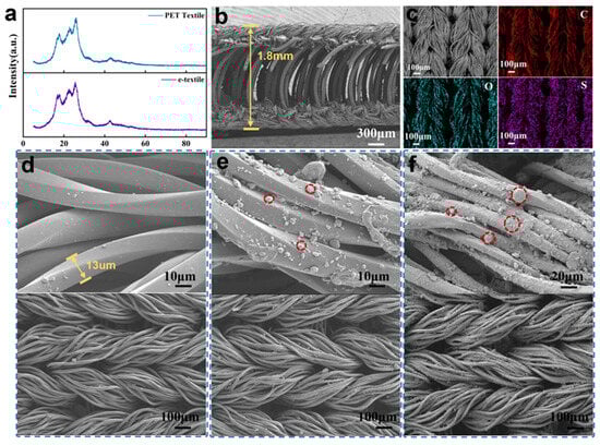 (a) XRD images of initial textile and conductive textile; (b) The side view of the conductive textile; (c) EDS mapping images of C.O.S. elements; (d) SEM image of the initial textile surface; (e) SEM image of the PEDOT:PSS/SWCNTs textile surface without chitosan; (f) SEM image of the PEDOT:PSS/SWCNTs/CS@PET textile surface.