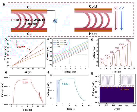 (a) Thermoelectric effect diagram of dual−mode sensor; (b) The Seebeck coefficient of PEDOT:PSS and SWCNTs after different proportions of impregnation; (c) I–V curves at different temperatures; (d) The thermal voltage generated by the dual-mode sensor at different temperatures; (e) The minimum detection limit of temperature difference; (f) Temperature response time; (g) Cyclic testing of temperature response.
