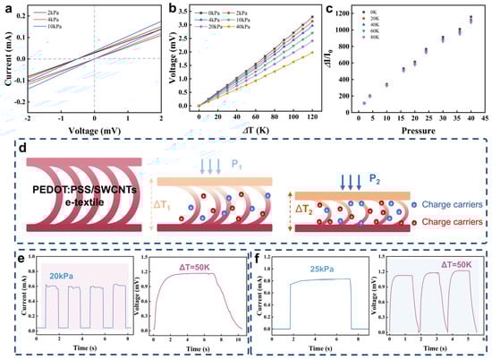 For dual-mode temperature–pressure sensing, the sensor should have a signal decoupling function to independently detect and distinguish temperature and pressure signals without interference. To study its two-parameter sensing ability, temperature and pressure stimuli are applied to the sensor at the same time. As shown in Figure 5a, when the pressure increases, the 3D conductive network of the textile will gradually compress as the pressure increases, resulting in a decrease in resistance and an increase in the slope of the current–voltage curve. The thermoelectric voltage generated by the temperature rise corresponds to the intercept of the current–voltage curve. According to this principle, the sensor can read these two independent parameters at the same time. As shown in Figure 5b, we recorded the relationship between the thermal voltage and the temperature difference in the range of 0–120 K under 0–40 kPa. It can be found that, in the low-pressure region, the slope of the curve changes little, indicating that the pressure has little effect on the temperature sensing, but, as the pressure increases, the slope of the curve decreases significantly. This is mainly because, under external pressure, the upper and lower layers of textiles are in close contact, and the air interlayer in the middle is compressed. The thermal conductivity between the two is significantly enhanced, which has a negative impact on the Seebeck coefficient. As shown in Figure 5c, the sensitivity curves of the sensor to pressure almost overlap under the temperature change of 0–80 K, which indicates that the temperature has little interference with the pressure response of the sensor. According to thermoelectric physics, the carriers inside the material will migrate from the high-temperature side to the low-temperature side under the temperature gradient, resulting in thermoelectric voltage (as shown in Figure 5d). The generated thermal voltage depends largely on the energy difference between the carriers on both sides of the material along the temperature gradient. It is also worth noting that the change in carrier energy with temperature can be reflected in the change in its energy band, while the pressure stimulation of 0–40 kPa has little effect on the energy band of the carrier. Therefore, when both temperature and pressure stimuli are applied, the thermal voltage depends mainly on the temperature gradient rather than the pressure. It is worth noting that the interference between temperature and pressure can be neglected in the low-pressure and low-temperature regions. Figure 5e shows that there is no effect on the response to temperature when the pressure changes at a low level. Figure 5f shows that there is little effect on the response to pressure when the temperature changes. Therefore, the signal decoupling mechanism of the sensor is mainly attributed to the pressure-independent energy band of the conductive material. This ensures that the voltage signal generated by the temperature stimulation and the resistance signal generated by the pressure stimulation will not interfere with each other, thereby achieving high-precision dual-mode detection without crosstalk.