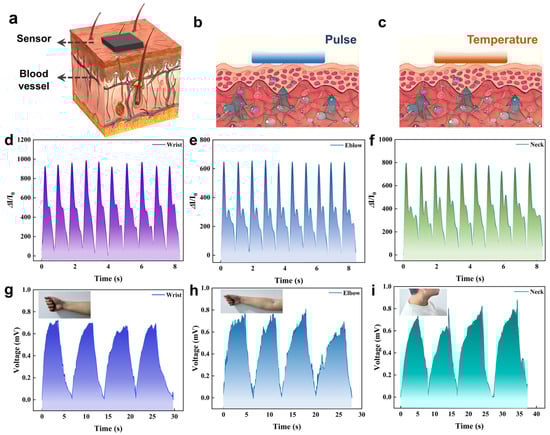 (a) A schematic diagram of the sensor measuring on the skin surface; (b) Pulse signal monitoring diagram; (c) Body temperature signal monitoring diagram; (d–f) Pulse signals in the wrist, elbow, and neck; (g–i) Temperature signals on the wrist, elbow, and neck. (I0: Initial current when no pressure is applied).