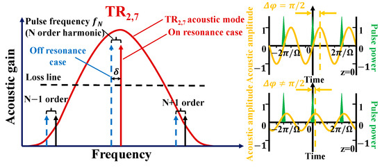 According to the phase matching conditions, when Δ φ is within the range of (0, π), sound gain occurs, and when Δ φ = π / 2 (Δ = 0), the sound wave amplitude reaches its maximum value. In this study, the TR2,7 mode was selected due to its highest theoretical scattering efficiency [5]. This selection enhances the passive mode locking output with a higher SMSR. TR2,7 mode microwave photonic oscillation can be achieved by enhancing FSBS passive mode locking and adjusting the PCs to match the phase matching conditions.
