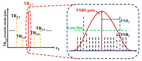 where Lm (m = 1,2) is the ring length of the main and sub ring cavities, and n = 1.4682 is the effective refractive index of SMF. The FSR1 and FSR2 are about 10 kHz and 41 kHz respectively. As shown in Figure 3, when the pump light from v p is injected into SMF, it excites FSBS. If the FSR of the double ring cavity exceeds the gain bandwidth of FSBS and the gain is greater than the loss, FSBS can only oscillate at frequencies that satisfy both resonance conditions of the main ring cavity and sub-ring cavity. The yellow dashed arrow in Figure 3 represents the upper sideband of each FSBS, while the red solid arrow represents the TR2,7 mode FSBS SLM achieved by adjusting the PCs in the double ring cavity.