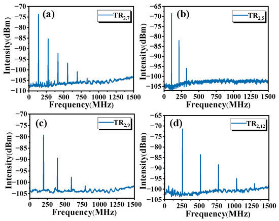 NPR passive mode-locking in TR2,m acoustic modes can be achieved by carefully adjusting the PCs in the single ring cavity. As shown in Figure 4, we have implemented mode locking for TR2,m modes with high theoretical scattering efficiency, such as TR2,7 (139.0 MHz), TR2,5 (107.4 MHz), TR2,9 (199.3 MHz) and TR2,12 (258.8 MHz). These acoustic modes can produce high experimental intensity mode locking. Among them, the TR2,7 mode has the highest theoretical scattering efficiency value [5]. In addition to high experimental intensity, the TR2,7 mode is easier to realize mode locking and generate more higher-order modes than the other modes in our experiment, which has important research value. Therefore, in the subsequent experiment, we chose the TR2,7 mode as an example to carry out the research.
