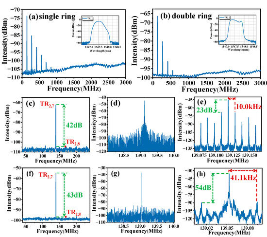 In the double ring cavity, SLM output can be achieved under the Vernier effect. Figure 5a,b illustrate the heterodyne spectra within 3 GHz span in single ring and double ring cavities, respectively, with a RBW of 1 kHz. The upper right graphs show the spectral detection with a central wavelength of 1547.6 nm. The peak at 139 MHz and its integer multiples correspond to the mode locking at the 13,605 (N) harmonic of the fundamental cavity frequency (0.0102 MHz). Figure 5c–e and Figure 5f–h show the heterodyne spectra at 200 MHz, 2 MHz and 100 kHz spans in single ring and double ring cavities, respectively. Among them, the RBW for Figure 5e,h is set at 50 Hz. The acoustic mode suppression ratios presented in Figure 5c,f are measured at 42 dB and 43 dB, respectively, surpassing the values reported in prior studies [22]. Comparing Figure 5d with Figure 5g, it can be seen that the TR2,7 mode microwave photonic adjacent longitudinal modes are well suppressed when there is a sub ring cavity. When the span is reduced to 100 kHz and there is no sub ring cavity, the spacing between TR2,7 mode microwave photonic adjacent longitudinal modes is 10.0 kHz in Figure 5e, almost corresponding to the FSR of 20 km SMF, and the SMSR is 23 dB. Moreover, the SMSR of the double ring cavity is 54 dB, as shown in Figure 5h, which is 31 dB higher than that of the single ring cavity, achieving a good SLM effect. The TR2,7 mode microwave photonic adjacent longitudinal mode spacing is 41.1 kHz, almost corresponding to the FSR of the double ring cavity.