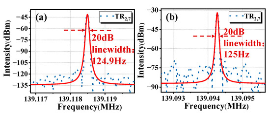 Figure 6. Linewidth measurement results. (a) In the single ring cavity; (b) in the double ring cavity.