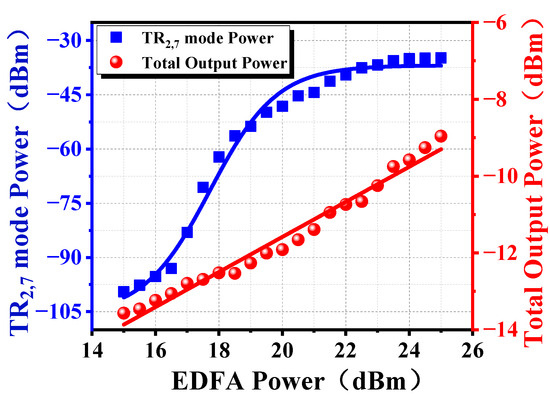 Figure 7 shows the threshold measurement of a double ring all-optical microwave oscillator. In the experiment, the total output power of the all-optical microwave oscillator is measured by OSA, and the TR2,7 mode microwave photonic output power is measured by ESA. Obviously, the total output power of the all-optical microwave oscillator increases linearly with the EDFA pump light power. Furthermore, the TR2,7 mode microwave photonic output power gradually increases before the pump power reaches 16.5 dBm, then sharply increases when it reaches 16.5 dBm, and subsequently stabilizes. The experiment indicates that the threshold of the double cavity all-optical microwave oscillator is about 16.5 dBm pump power.