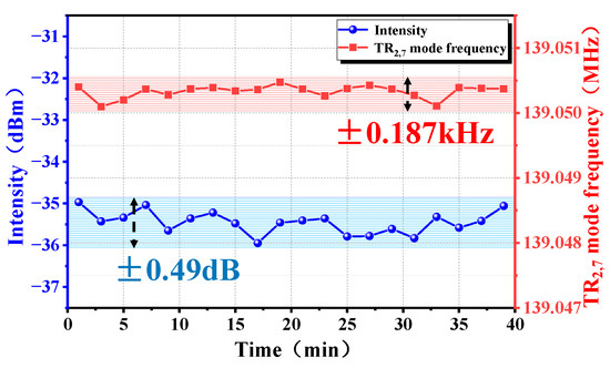 Through long-term testing (maintained for about 40 min here), we have demonstrated that our designed system is stable. To ensure the accuracy of the measurement results, the SMF in the dual ring cavity was placed in a thermostat at 25 °C with a resolution of 0.2 °C. As shown in Figure 8, the TR2,7 mode microwave photonic power fluctuation is ±0.49 dB, and this may be caused by the TR2,7 mode microwave photonic sensitivity to environmental temperature and noise. In terms of frequency stability, the TR2,7 mode microwave photonic frequency variation fluctuates within a range of ±0.187 kHz, far less than twice the FSR, and there is no mode hopping phenomenon.