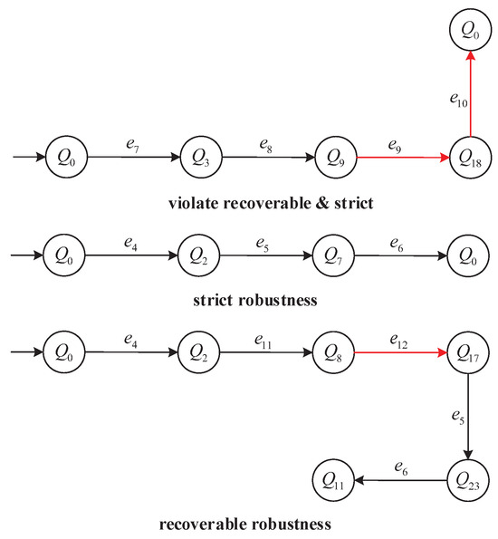 (iii) Bottom path: Satisfies Recoverable robustness by continuing through reliable events after to reach a terminal state.