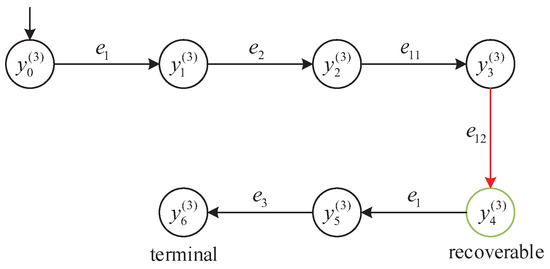 Let y denote the state reached after executing the prefix . According to the detector classification in , the state is labeled as Recoverably robust. This classification is justified because, although is an unreliable event, there exists a valid recovery sequence from y that leads to the terminal state . Thus, the Recoverably robust label permits continuation beyond an unreliable event provided a complete recovery path is guaranteed.