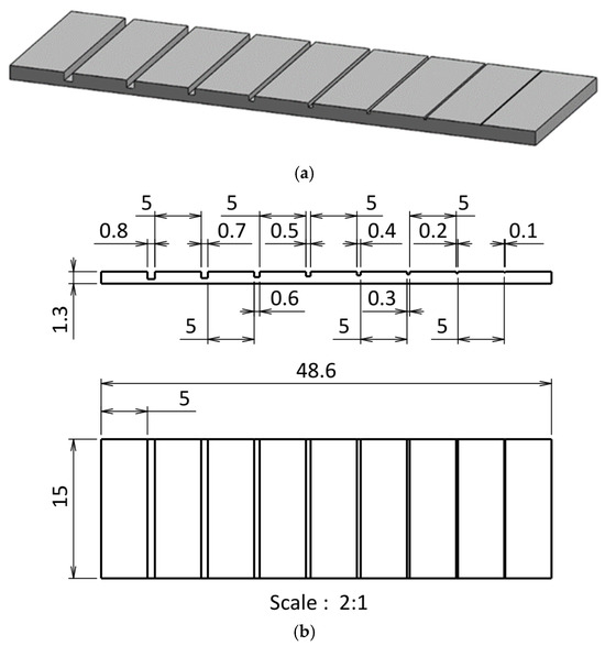 The test part was designed using SolidWorks 2016 (Dassault Systèmes, Vélizy-Villacoublay, France) and exported in STL format for slicing. The part measures 48.6 mm × 15 mm × 3 mm (length × width × height), ensuring compatibility with common FDM build plates while minimizing print time and material usage. As illustrated in Figure 1, the design incorporates longitudinally aligned microchannels with nominal square cross-sections ranging from 0.8 mm to 0.1 mm in both width and depth, with decrements of 0.1 mm. Equal spacing between channels was implemented to prevent thermal coupling or mechanical distortion during printing.