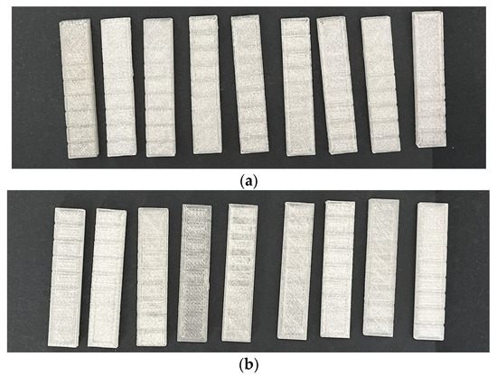 Each of the 27 parameter combinations was printed in triplicate for each material, resulting in a total of 81 samples per material (162 total). 9 printed samples from PETG and TPU are presented in Figure 2.