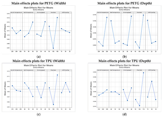 Main effects plots for PETG: (a) mean width deviation, (b) mean depth deviation, and TPU: (c) mean width deviation, and (d) mean depth deviation.