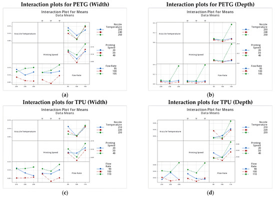 Interaction effects plots for PETG: (a) mean width deviation, (b) mean depth deviation, and TPU: (c) mean width deviation, and (d) mean depth deviation.