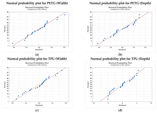 Normal probability plot for PETG: (a) width, (b) depth, and for TPU: (c) width, and (d) depth.
