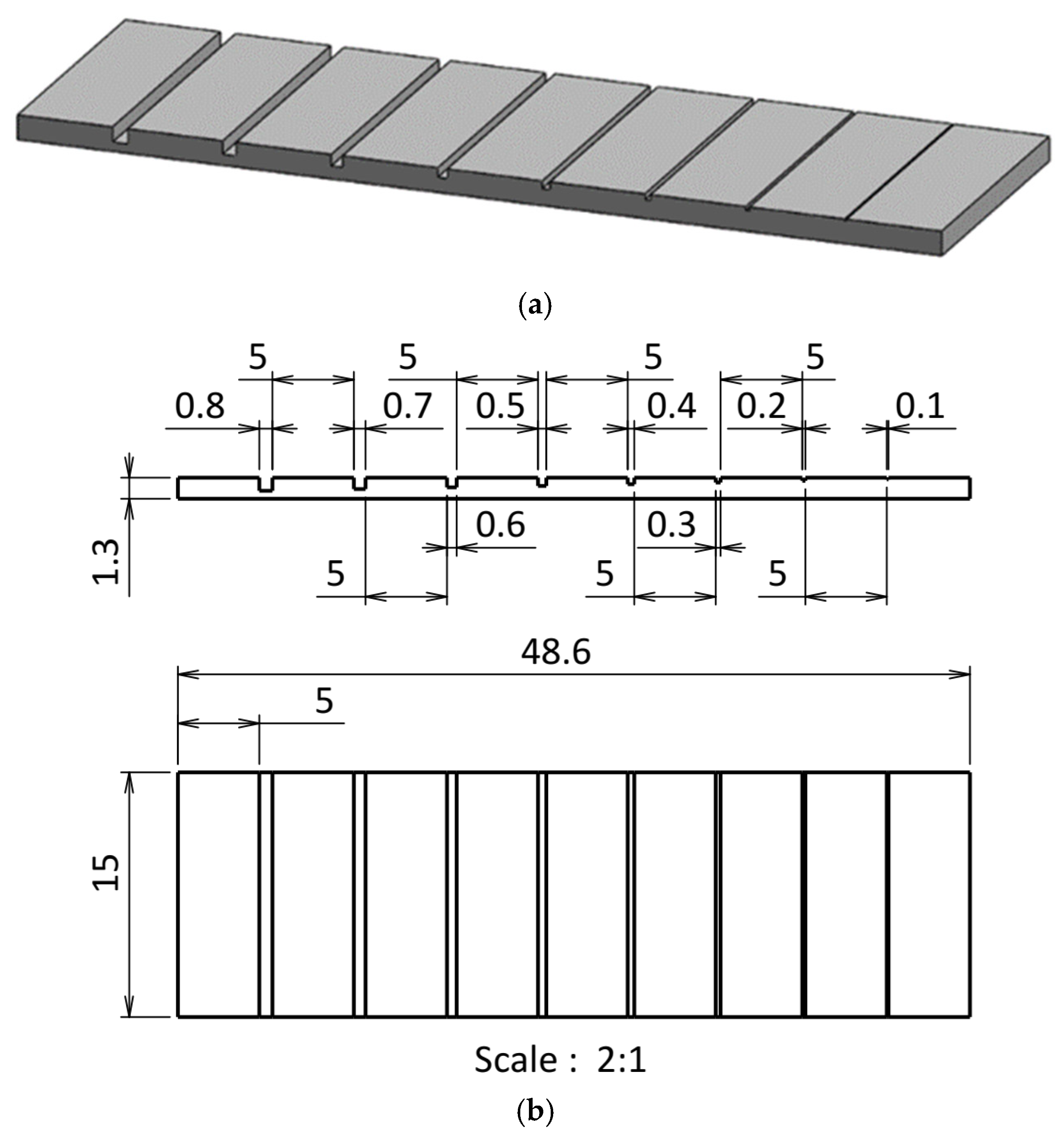 Figure 1, the design incorporates longitudinally aligned microchannels with nominal square cross-sections ranging from 0.8 mm to 0.1 mm in both width and depth, with decrements of 0.1 mm. Equal spacing between channels was implemented to prevent thermal coupling or mechanical distortion during printing.