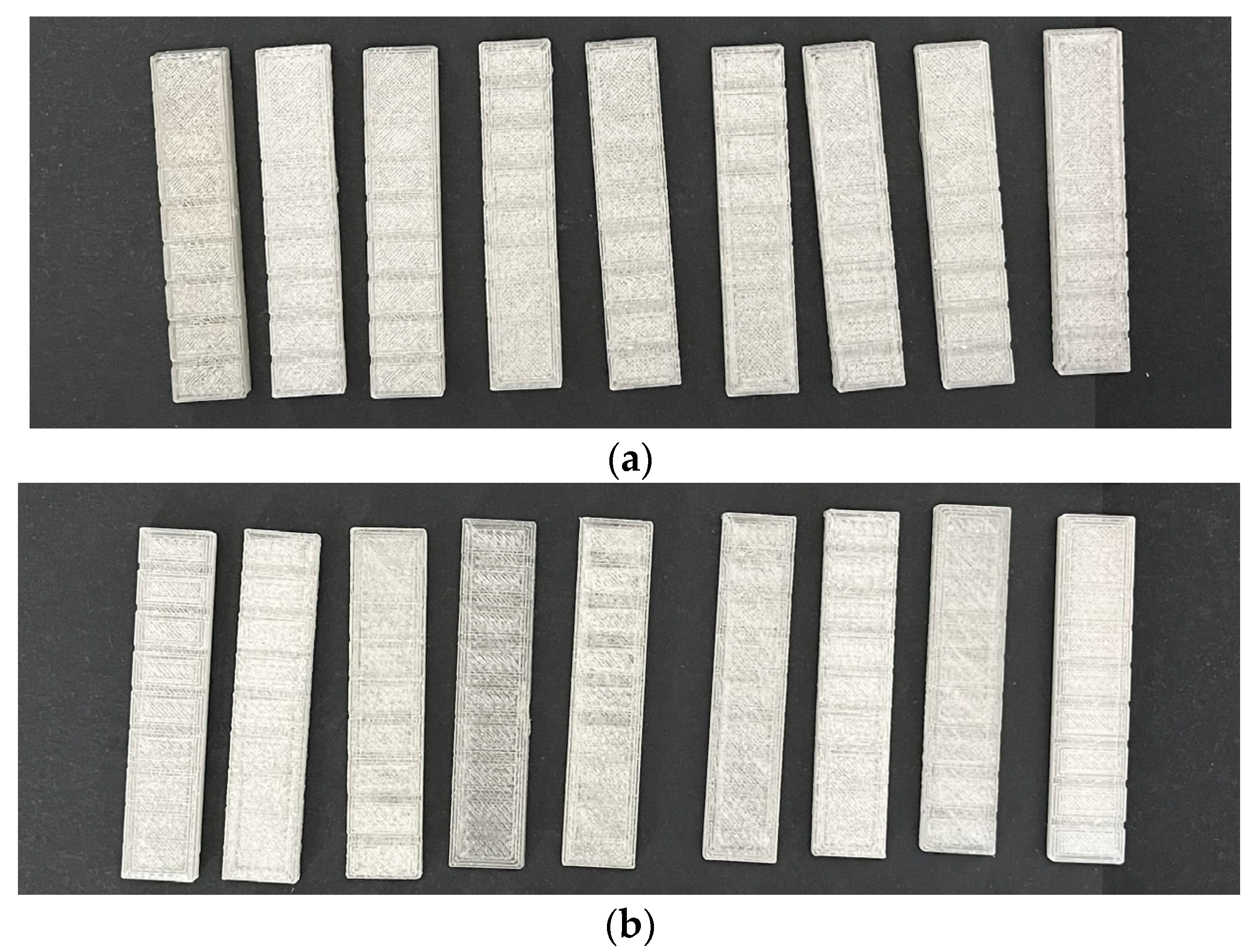 The five FDM parameters were selected based on their well-established influence on melt flow behavior, interlayer bonding, and geometrical precision at the microscale, as consistently reported in previous investigations. In addition, preliminary printability trials in our laboratory were used to confirm the practical feasibility of the selected ranges and to exclude extreme values that led to under-extrusion, unstable flow, or part warping. This dual basis, the literature precedent and empirical validation, ensured that the selected ranges were scientifically grounded and experimentally reliable.