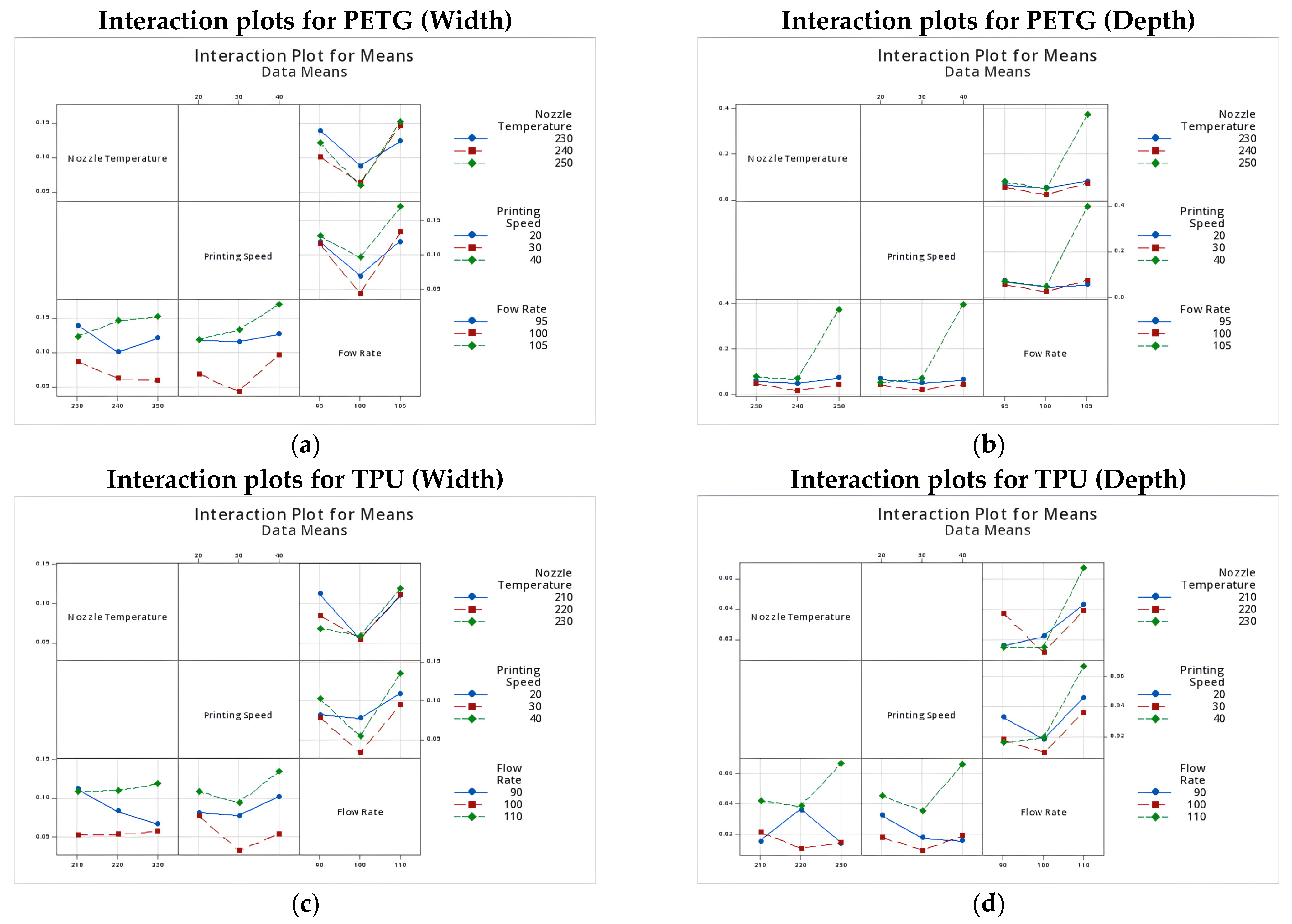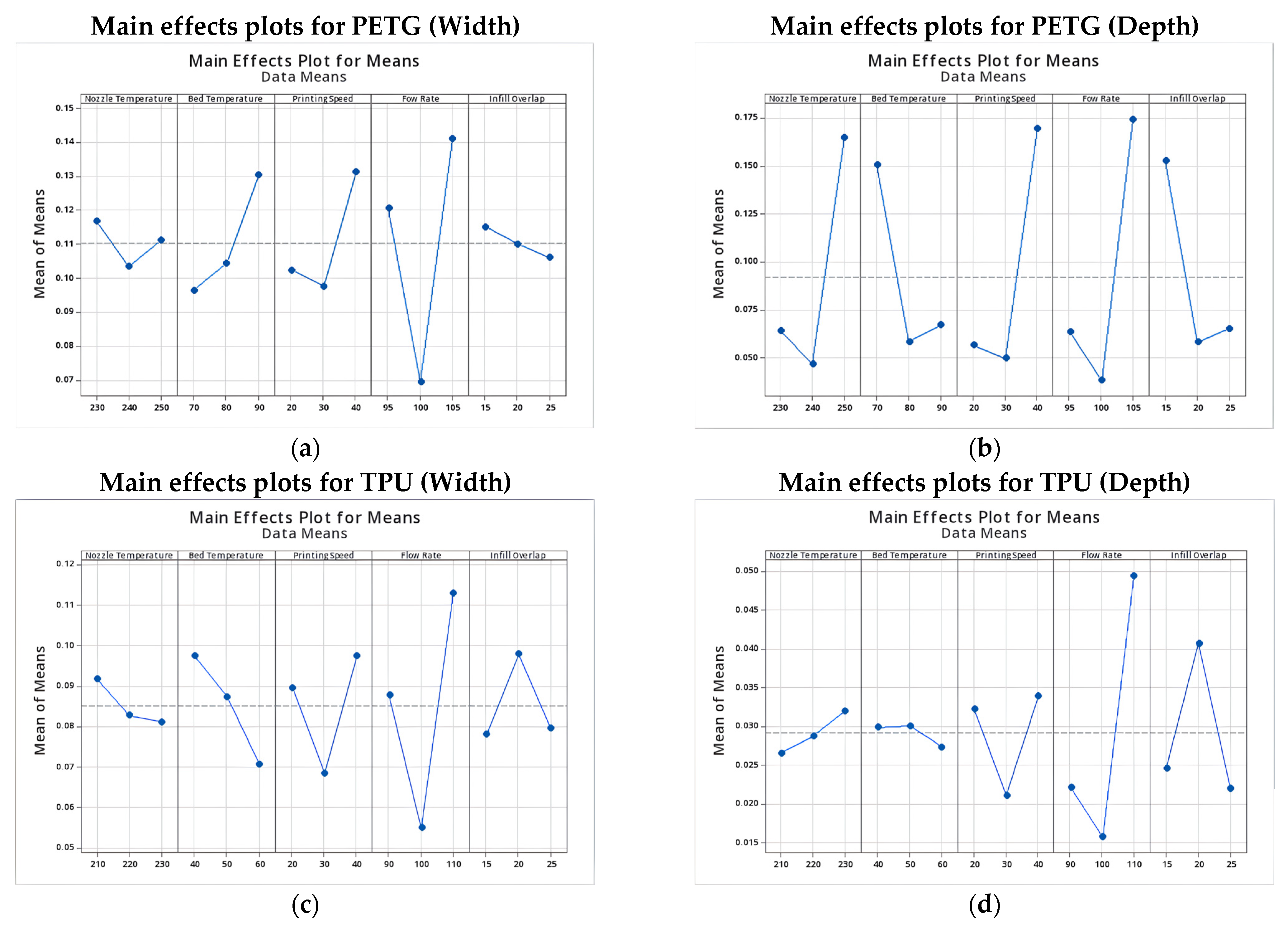 These results provide dual confirmation that, for TPU, both width and depth deviations are significantly influenced by parameter variation. They underscore the critical importance of precise parameter optimization when working with flexible filaments, where thermal and mechanical behavior is more complex and less forgiving than with rigid materials.