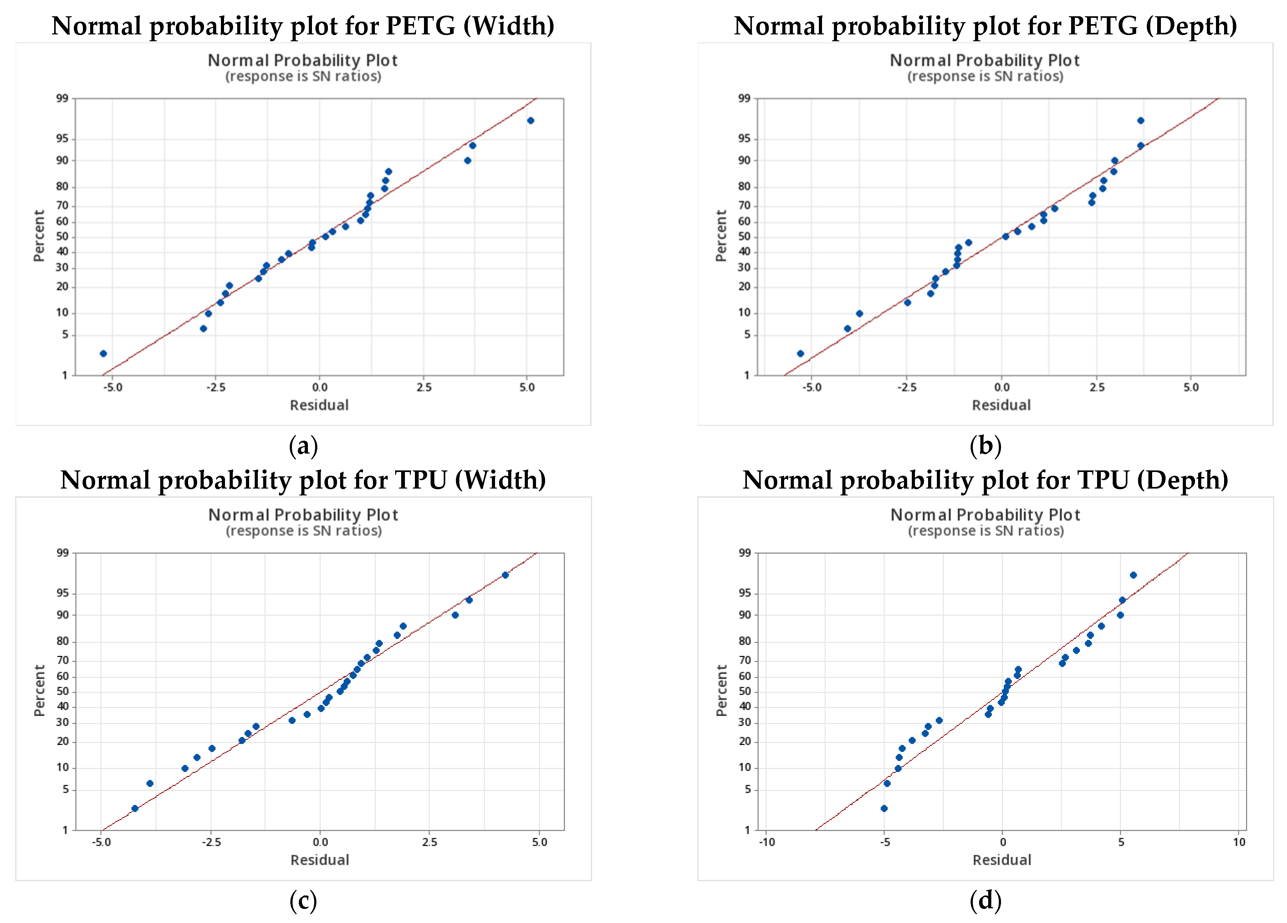 To verify the validity of the Taguchi model and the assumptions underlying the ANOVA results, a residual analysis was conducted. Normal probability plots of the residuals for both width and depth signal-to-noise (