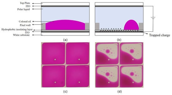 The pixel structure of EWDs mainly consists of the top glass, ITO electrode, pixel wall, polar liquid, colored oil, hydrophobic insulating layer (fluoropolymer), and bottom substrate. When no voltage is applied, the oil covers the whole bottom of the pixel, the pixel presents the color of the oil at this time, and the EWD is in the “off” state, as shown in Figure 1a,c. On the contrary, when a certain voltage is applied between the electrodes, the surface tension of the liquid changes and the liquid is pushed or diffused, so that the surface of the hydrophobic insulating layer can be displayed, as shown in Figure 1b,d.
