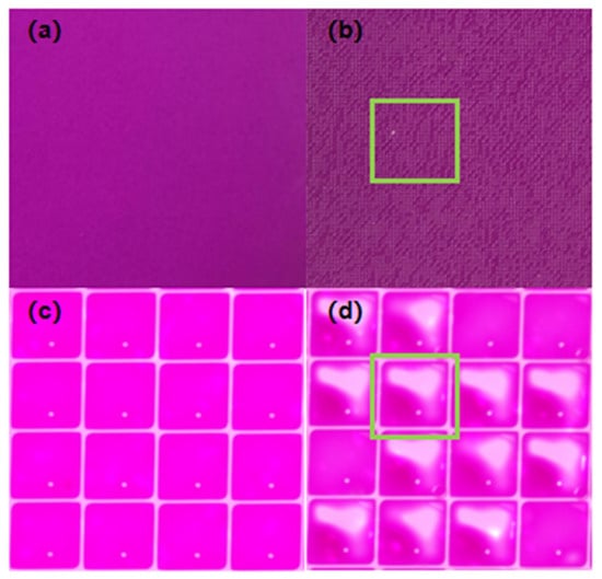 It can be seen that the driving voltage is proportional to the thickness of the hydrophobic insulating layer. When the driving voltage increases to a critical value, a phenomenon occurs where the contact angle no longer decreases as the voltage continues to rise, which is known as contact angle saturation []. Subsequent further increases in the driving voltage will disrupt the stability of the oil, leading to the failure of the EWD. When no voltage is applied, the oil in the pixel should spread evenly across the bottom. This phenomenon, as observed with the naked eye and under a microscope, is shown in Figure 2a,c, respectively. However, after the EWD fails, colored oil droplets remain trapped in the corners of the pixel and cannot spread back or even overflow into adjacent pixels, forming scattered white spots. This phenomenon, as observed with the naked eye and under a microscope, after failure is shown in Figure 2b,d, respectively, where the regions of obvious failure are highlighted with green frames. Therefore, an excessively high driving voltage should not be applied during the experiment.