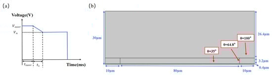 where and are, respectively, the effective capacitance and effective current of a single pixel; and are, respectively, the capacitances of the oil and the hydrophobic insulating layer; is the vacuum dielectric constant; and are, respectively, the dielectric constants of the oil and the hydrophobic insulating layer, is the area where oil shrinks to the corners of a pixel; and is the area of a single pixel. and are, respectively, the thicknesses of the oil and the hydrophobic insulating layer, and is the applied driving voltage. In addition, the correspondence between contact angle and driving voltage can be described by the Lippmann–Young equation [], which can be modified according to refs. [,], as shown in Equation (3).