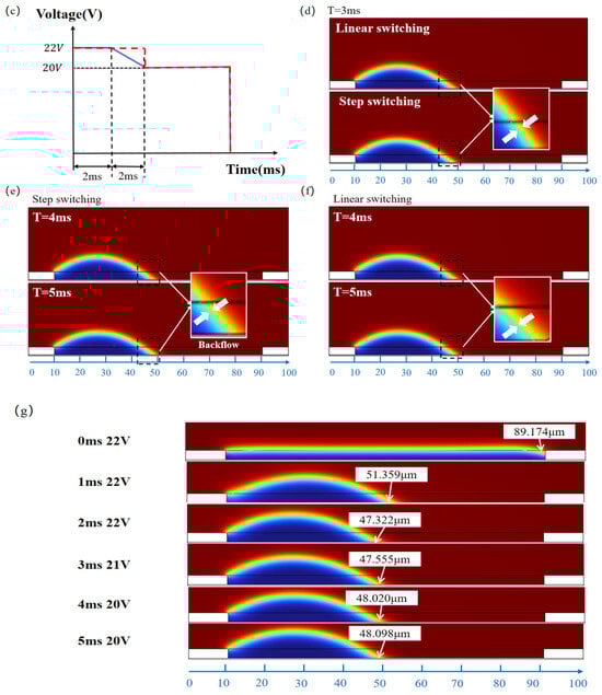 The 2D geometric model and simulation comparison. (a) The designed pulse, where represents the switching phase time, represents the stable driving voltage value, and and represent the overdrive voltage and time, respectively; (b) the 2D geometric model; (c) a comparison of step and linear switching pulse; (d) the oil contraction behavior under different pulses at 3 ms; (e) the oil contraction behavior under the step switching pulse at 4 ms and 5 ms; (f) the oil contraction behavior under the linear switching pulse at 4 ms and 5 ms; (g) simulation of oil contraction under the proposed linear driving pulse from 0 ms to 5 ms.