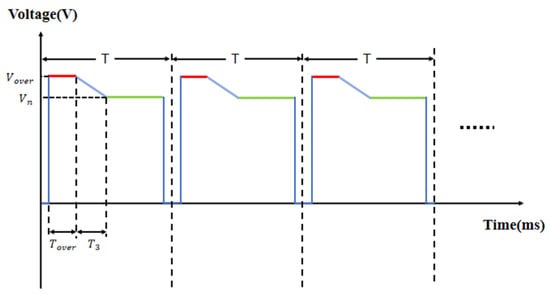 Electrowetting display (EWDs) [], as emerging reflective display technologies, have become a research hotspot in the field of display technology due to their significant advantages, such as high reflectivity [], fast response speed, and low power consumption [,]. However, although EWD technology has many potential advantages, it still faces many challenges in terms of practical application, such as luminance reduction caused by charge trapping []. Therefore, it is of great significance to solve these problems by optimizing the overdriving pulse in order to promote the commercialization and industrialization of EWD technology. So far, most studies on EWDs mainly aim to optimize or design a new driving pulse to reduce oil splitting [,,], oil backflow [,,], charge trapping [,,], or optimize pixel structure [,,], aiming to improve performance metrics such as aperture ratio, response speed, and luminance stability. Among them, response speed is an important indicator. To improve the response speed of droplets or pixels, researchers have proposed a variety of gradually optimized driving strategies and methods. Early research mainly focused on enhancing response performance by applying an overdriving voltage. For example, by studying the spreading behavior and response time of droplets under different DC and overdriving conditions, appropriate overdriving signals were selected to improve the response speed of viscous fluids []. Similarly, regarding the issue of response time for the rising use of electrowetting-driven low-viscosity liquid columns, studies have found that, compared with DC driving, the overdriving pulse can effectively reduce the response time []. Meanwhile, to further shorten the response time of the devices, an input voltage function with multiple exponential rise times was adjusted []. With the deepening of research, single-voltage control gradually evolved into multi-stage pulse design to balance speed and stability. For instance, a driving pulse based on the overdriving voltage and charge trapping theory was proposed, which shortens the response time of EWDs while taking charge trapping control into account []. To suppress oil backflow in the active matrix, a separated reset pulse was designed. In the first stage, an overdriving voltage is used to increase the response speed, while the voltage of all pixels is inverted to achieve a stable state []. Aiming at the impact of the hysteresis effect, an equivalent driving pulse design method with an overdriving voltage was proposed, which effectively improved the response performance []. Based on the analysis of the oil backflow phenomenon, a new driving pulse using an exponential function was proposed. This pulse increases the voltage exponentially, starting from the threshold voltage, and combines with overvoltage driving to suppress splitting and improve response speed []. To further break through performance bottlenecks, research has begun to focus on both pixel structure and pulse. At the pixel structure level, a multi-electrode pixel structure was proposed. This multi-electrode pixel structure divides the pixel into four square sub-electrodes, and a three-dimensional EWD simulation model was established for verification, improving the response speed through physical design []. At the pulse design level, to suppress charge trapping and mitigate the impact of leakage current, an efficient driving pulse was proposed. It uses an overdriving voltage in the driving stage to accelerate the response speed and maintains the target voltage in the stable stage to sustain the state []. Similarly, a multi-channel DC overdriving pulse was proposed, which divides the pulse into a start-up driving stage and a stable driving stage. The introduction of an overdriving voltage in the start-up stage significantly improved the response speed and enhanced grayscale consistency []. In addition, a new composite function pulse based on a sampling function has been proposed in recent years, which consists of an initial driving stage and a backflow suppression stage. In the initial driving stage, an overdriving voltage is used to quickly drive the pixel, and the overdriving voltage is attenuated to the target voltage, which not only improves the response speed but also effectively prevents damage to the pixel []. It can be seen that the above studies improve the response speed in different ways, most of which involve adding to the overdriving voltage to improve the response speed. However, when using overdriving voltage, the phenomenon of glitches in the luminance curve is ignored, which affects the stability of the luminance of the display.