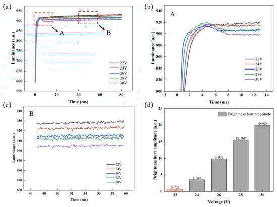 Test data for different overdriving voltages. (a) Luminance–time curves at different overdriving voltages, where the response times corresponding to overdriving voltages of 22 V, 24 V, 26 V, 28 V, and 30 V are calculated to be 65.55 ms, 66.93 ms, 68.27 ms, 69.34 ms, and 71.29 ms, respectively; (b) enlarged view of area A in Figure 5a; (c) enlarged view of area B in Figure 5a; (d) comparison of luminance glitch amplitudes under different overdriving voltages.