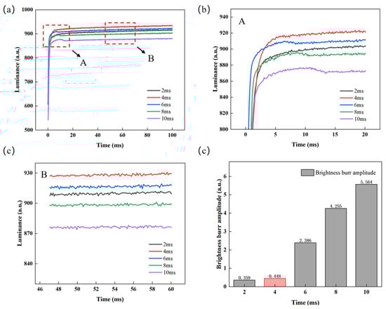 After determining the optimal parameters of the overdriving voltage, the influence of the overdriving time on luminance and the glitch phenomenon is further analyzed by testing the luminance–time curve. The overdriving voltage was set to 22 V, and the overdriving time was set to 2 ms, 4 ms, 6 ms, 8 ms, and 10 ms, respectively. The luminance rise curves corresponding to different overdriving times are shown in Figure 6a. At first, with the increase in overdriving time, the luminance rises faster and faster, and the luminance increases gradually. However, when the overdriving time increases to a certain value and continues to increase, the luminance rise speed decreases and glitches appear, as shown in Figure 6b. The reason for this phenomenon is that the excessive overdriving time (>6 ms) increases the time maintaining the reverse electric field, resulting in more accumulated charges in the hydrophobic insulating layer, reducing the effective driving voltage greatly. Meanwhile, the stabilized luminance decreases and the glitch amplitude increases, as shown in Figure 6d. Meanwhile, as shown in Figure 6c, the glitch amplitude is approximately 0 when the overdriving time is 2 ms or 4 ms, and the luminance value is the highest at 930.51 when the overdriving time is 4 ms. Therefore, the overdriving time was set to 4 ms for a better display effect.