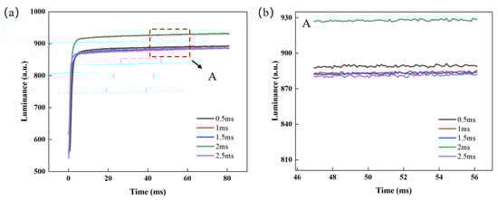 Test data for different switching times. (a) Luminance–time curves at different switching times, where the response times corresponding to switching times of 0.5 ms, 1 ms, 1.5 ms, 2 ms, and 2.5 ms are calculated to be 66.2 ms, 65.8 ms, 66 ms, 65.55 ms, and 66.5 ms, respectively; (b) enlarged view of area A in Figure 7a.