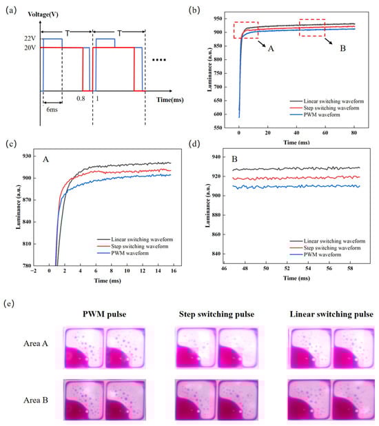 A comparison among the linear switching pulse, step switching pulse, and PWM pulse. (a) PWM pulse and step switching pulse. (b) Luminance–time curves under the proposed pulse, step switching pulse, and PWM pulse. (c) Enlarged view of area A in Figure (b). (d) Enlarged view of area B in Figure (b). (e) Photographs of the instantaneous displays of the EWD states corresponding to the two areas in Figure 8b: (top row) the display state during the glitch occurrence phase (area A); (bottom row) the display state during the stable phase (area B). The corresponding driving pulses are as follows: (left) PWM pulse, (middle) step switching pulse, (right) linear switching pulse proposed in this paper.