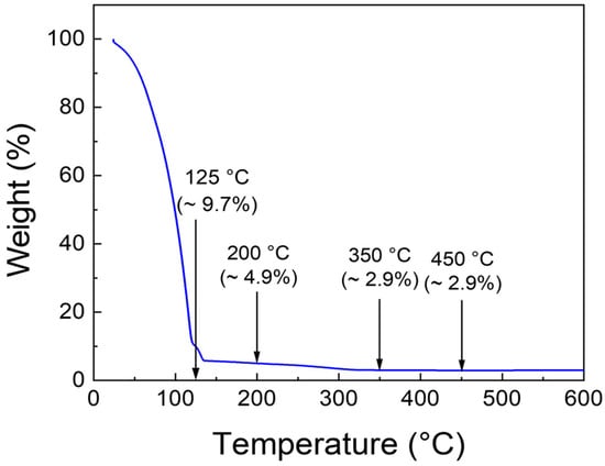 A 0.2 M precursor solution was prepared by dissolving indium nitrate hydrate (In(NO3)3·xH2O, 99.999%, Sigma-Aldrich, St. Louis, MO, USA) in 5 mL of 2-methoxyethanol anhydrous (CH3OCH2CHOH, 99.8%, Sigma-Aldrich, St. Louis, MO, USA). The solution was magnetically stirred at 350 rpm on a hot plate maintained at 75 °C for 5 h to ensure complete dissolution and compositional homogeneity. Thermogravimetric analysis (TGA) N-1000 system (Scinco, Seoul, Republic of Korea) was performed to investigate the thermal decomposition behaviour of the precursor solution. The measurement was carried out under a nitrogen atmosphere with a heating rate of 10 °C/min from 25 to 600 °C. The TGA curve of the precursor solution is shown in Figure 1.