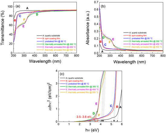 Figure 2b shows the absorption spectra of the films as a function of wavelength. The bare quartz substrate, spin-coated film, and the film prebaked at 80 °C exhibited an absorption edge below approximately 350 nm. In contrast, the films annealed at 350, 450, and 550 °C exhibited absorption edges in the ranges of 300–320 nm and 260–320 nm, indicating enhanced absorption in the UV region. The optical band gap energy (Eg) was estimated using Tauc’s relation, (αhν)2 ∝ (hν − Eg), where α is the absorption coefficient, h is Planck’s constant, and ν is the photon frequency. The absorption coefficient (α) was calculated from the transmittance (T) using the relation: α = [2.303 × log(1/T)]/d, where d is the film thickness. Figure 2c presents the Tauc plots, i.e., (αhν)2 versus hν, from which Eg was determined by extrapolating the linear portion to (αhν)2 = 0 [12,13]. The estimated Eg values were approximately 5.5 eV for the bare quartz substrate, 5.3 eV for the spin-coated film, and 5.2 eV for the film prebaked at 80 °C.