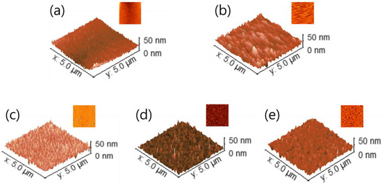 AFM images (5 μm × 5 μm) of the solution-process films fabricated through (a) spin-coating, (b) prebaking at 80 °C, thermal annealing at temperatures of (c) 350, (d) 450, (e) 550 °C.