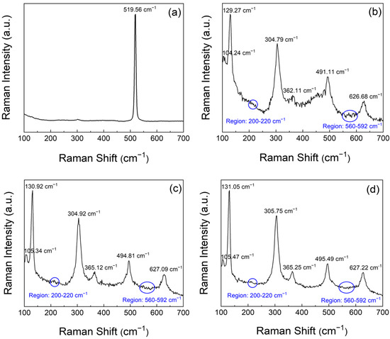 Figure 4 illustrates the results of Raman spectroscopic analysis of the solution-processed In2O3 thin films. Micro-Raman spectroscopy was performed using a Raman spectrometer equipped with a 532 nm excitation source under backscattering geometry. As shown in Figure 2c, the Raman spectra exhibit trends that align with the previously observed optical and crystallographic features, and reveal a clear distinction between the prebaked film at 80 °C and those subjected to thermal annealing at 350, 450, and 550 °C. The pre-baked film exhibits a single broad Raman peak centred at approximately 519.56 cm−1, as illustrated in Figure 4a, whereas the film annealed at 350 °C displays multiple distinct peaks at 104.24, 129.27, 304.79, 362.11, 491.11, and 626.68 cm−1, as shown in Figure 4b. In general, a shift in the Raman peaks towards higher wavenumbers is indicative of compressive stress. Thus, these spectral changes are indicative of the increased internal stress induced by thermal annealing [19]. This observation is consistent with the agglomeration of nanocrystalline grains in the prebaked film, as shown in Figure 2a,b. Such grain agglomeration becomes more pronounced following annealing at 350 °C. In2O3 typically crystallizes in a cubic bixbyite structure, belonging to the Ia-3 (Th7) space group, wherein the vibrational modes with Ag, Eg, and Tg symmetries are Raman active, and the Tu modes are infrared (IR) active [20]. The Raman spectrum of the film annealed at 450 °C (Figure 4c) exhibits distinct vibrational modes at approximately 105.34, 130.92, 304.92, 365.12, 494.81, and 627.09 cm−1, which correspond well to the characteristic phonon modes of cubic In2O3 [21]. Similarly, the spectrum of the film annealed at 550 °C (Figure 4d) exhibits slightly upshifted peaks at approximately 105.47, 131.05, 305.75, 365.25, 495.49, and 627.22 cm−1, suggesting enhanced compressive stress induced by high-temperature annealing [6].