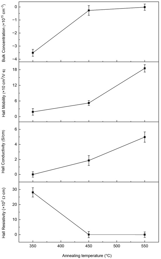 The peaks at approximately 131 and 305 cm−1 are attributed to the In–O bond vibrations and bending modes of the InO6 octahedra. Additionally, the satellite peaks observed at approximately 202, 568, and 588 cm−1 are indicative of residual stress in the thermally treated solution-processed films. Similar satellite features in the range of 572–582 cm−1 have also been reported in zinc oxide thin films and are typically attributed to intrinsic defects or oxygen vacancies induced by residual stress [22]. These oxygen vacancies are strongly associated with the blue emission characteristics of In2O3 [23]. The Raman peak observed at approximately 202 cm−1 remains unclear and warrants further investigation. Previous studies have suggested that this peak may arise from oxygen-vacancy-related local vibrational modes or strain/size-included activation of normally silent phonon modes [24]. The influence of the annealing temperature on the electrical properties of In2O3 thin films was investigated through Hall effect measurements. Herein, the results reveal systematic variations in key electrical parameters of the solution-processed In2O3 films with increasing temperature. As shown in Figure 5, a decreasing trend in resistivity was observed with increase in the annealing temperature. The key electrical parameters obtained from Hall effect measurements are listed in Table 1. At 350 °C, the resistivity was measured to be 2.81 × 103 Ω·cm, indicating limited electrical conductivity. With increased annealing temperature, the resistivity decreased to 6.58 Ω·cm at 450 °C and further to 1.29 Ω·cm at 550 °C. These results suggest that high-temperature annealing reduces structural defects and enhances charge carrier mobility The Hall mobility increased significantly from 18.4 cm2/V·s at 350 °C to 52.3 cm2/V·s at 450 °C, and further to 185 cm2/V·s at 550 °C. This enhancement is attributed to the improved crystallinity at higher annealing temperatures, which facilitates more efficient charge transport [25].