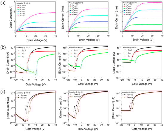 Figure 6 illustrates the electrical characteristics of TFTs incorporating solution-processed In2O3 channel layers annealed at 350, 450, and 550 °C. The output characteristics (Figure 6a) were measured by sweeping the drain voltage from −20 V to 40 V in 0.5 V increments, with the gate voltage varied from −10 V to 40 V in 10 V steps. A progressive increase in the drain current was observed with increasing drain voltage. Moreover, higher annealing temperatures led to a notable enhancement in the overall drain current, indicating an improved channel conductivity. The device annealed at 350 °C exhibited relatively low drain currents, whereas the TFT annealed at 450 °C showed well-defined pinch-off behaviour and enhanced current saturation, indicating improved carrier modulation and interface quality. The device annealed at 550 °C exhibited the highest drain current, reflecting enhanced charge transport, likely due to increased crystallinity and reduced defect density in the In2O3 channel [27]. The transfer characteristics of the devices are shown in Figure 6b. The measurements were conducted in both the saturation and linear regimes. In the saturation regime, the gate voltage was swept from −20 V to 40 V, while the drain voltage was held constant at 40 V, whereas in the linear regime, the gate voltage was swept over the same range with the drain voltage maintained at 1 V. The primary electrical characteristics of the fabricated TFTs, including the field-effect mobility (µ), subthreshold swing (SS), and threshold voltage (Vth), were determined from the transfer curves measured in the saturation regime (VDS = 40 V). The values of µ and SS were derived from the standard expressions for saturation current: