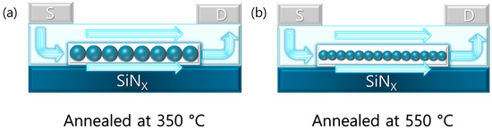 Raman spectroscopy confirmed that increasing the annealing temperature led to agglomeration of In2O3 grain and overall improvement in crystallinity. However, this enhancement in crystallinity can simultaneously increase the distribution of void-like defects near the interface and grain boundaries, which may hinder charge transport during the initial channel formation and thereby deteriorate the SS. As the gate voltage increases, the channel extends upward by the electric field, and carriers predominantly flow through the upper crystalline region where fewer traps exist. SS analysis thus reflects the combined effect of both fast and slow traps, whereas hysteresis primarily captures traps that can respond within the sweep time. The calculated values of Nit obtained from both methods are summarized in Table 3, based on the extraction approaches reported in previous studies [30,31]. Figure 7 illustrates the channel formation at 350 °C and 550 °C, indicating that interfacial voids contribute to an increased subthreshold swing (SS) while reducing hysteresis. Ultimately, even with improved crystallinity, the interfacial conditions and defect distribution still play a critical role in determining the electrical stability and reliability of the devices. Therefore, further studies focusing on the contact properties and energy distribution of defects at the semiconductor–insulator interface will be essential.