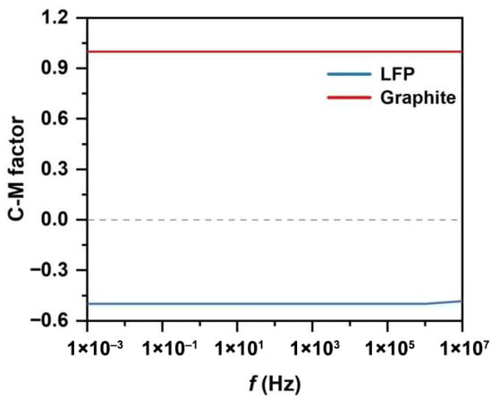 where and denote the complex permittivity of the particle and the suspending medium, respectively. The complex permittivity is defined as , where is the dielectric constant of the LFP or the solution, σ is the corresponding electrical conductivity, is the imaginary unit, and is the angular frequency of the applied electric field, with being the conventional (linear) frequency.