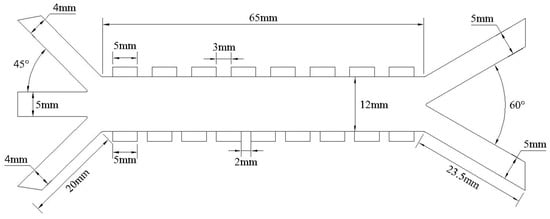 The microchannel inlet consists of sheath flow inlets on both sides and a central inlet for the mixed particle suspension. To focus the particles in a region favorable for separation, the angle between the sheath flows (inlets 1 and 3 in Figure 3) and the sample inlet (inlet 2 in Figure 3) is set to 45°. Driven by the sheath flow, the sample stream enters the separation channel. Under the combined effects of DEP and MAP, particles undergo lateral displacement. LFP particles, subjected to nDEP, are deflected toward and exit from the right outlet, while graphite particles, influenced by pDEP, migrate toward the left outlet. The detailed structural dimensions of the separator are shown in Figure 3.