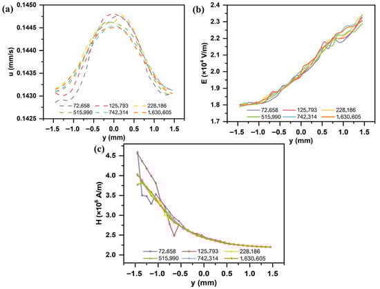 Grid independence verification of (a) velocity, (b) electric field, and (c) magnetic field.