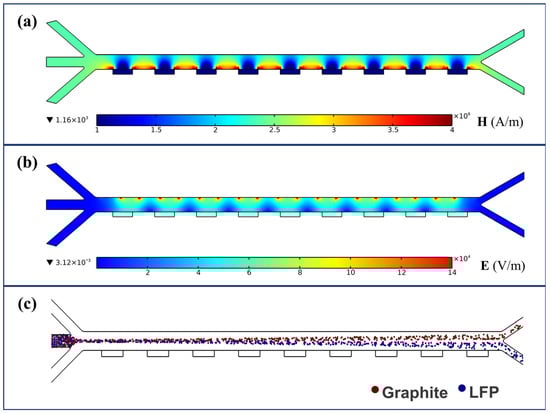 Based on the proposed separator model, numerical simulations were conducted under an arrayed configuration of external field components. The magnetic field distribution is shown in Figure 5a, where higher magnetic field intensity appears between the ferromagnetic blocks located on the side of the channel opposite the electrodes. These regions exhibit a significantly enhanced magnetic field strength, which further increases the lateral driving force acting on LFP particles. The electric field distribution, shown in Figure 5b, presents a stepwise non-uniform pattern that covers the majority of the channel area. Regions of high electric field strength are concentrated near the edges of the electrodes between the positive and negative poles, while the electric field intensity decreases with increasing distance from the electrode surfaces. The combined distributions of the magnetic and electric fields ensure the effectiveness of the applied external fields throughout the entire channel, maximizing the influence on particle trajectory alteration. Due to the use of slip boundary conditions at the channel walls, the fluid exhibits a uniform distribution within the separation channel. Under the combined effects of the flow field and external fields, the particle trajectories shown in Figure 5c were obtained. It can be observed that hydrodynamic focusing significantly influences the movement paths of the particles.