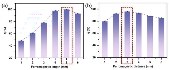 Effect of ferromagnetic structure on the separation efficiency of lithium iron phosphate (LFP): (a) ferromagnet length; (b) ferromagnet spacing (with B = 2.4 T, = 200 V, u = 30 mm/s, and f = 1 kHz).